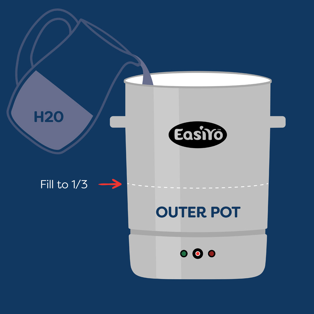 Put room temperature drinking water into the outer pot of the Yogurt Maker, filling to the line approximately a third of the way up the side.
