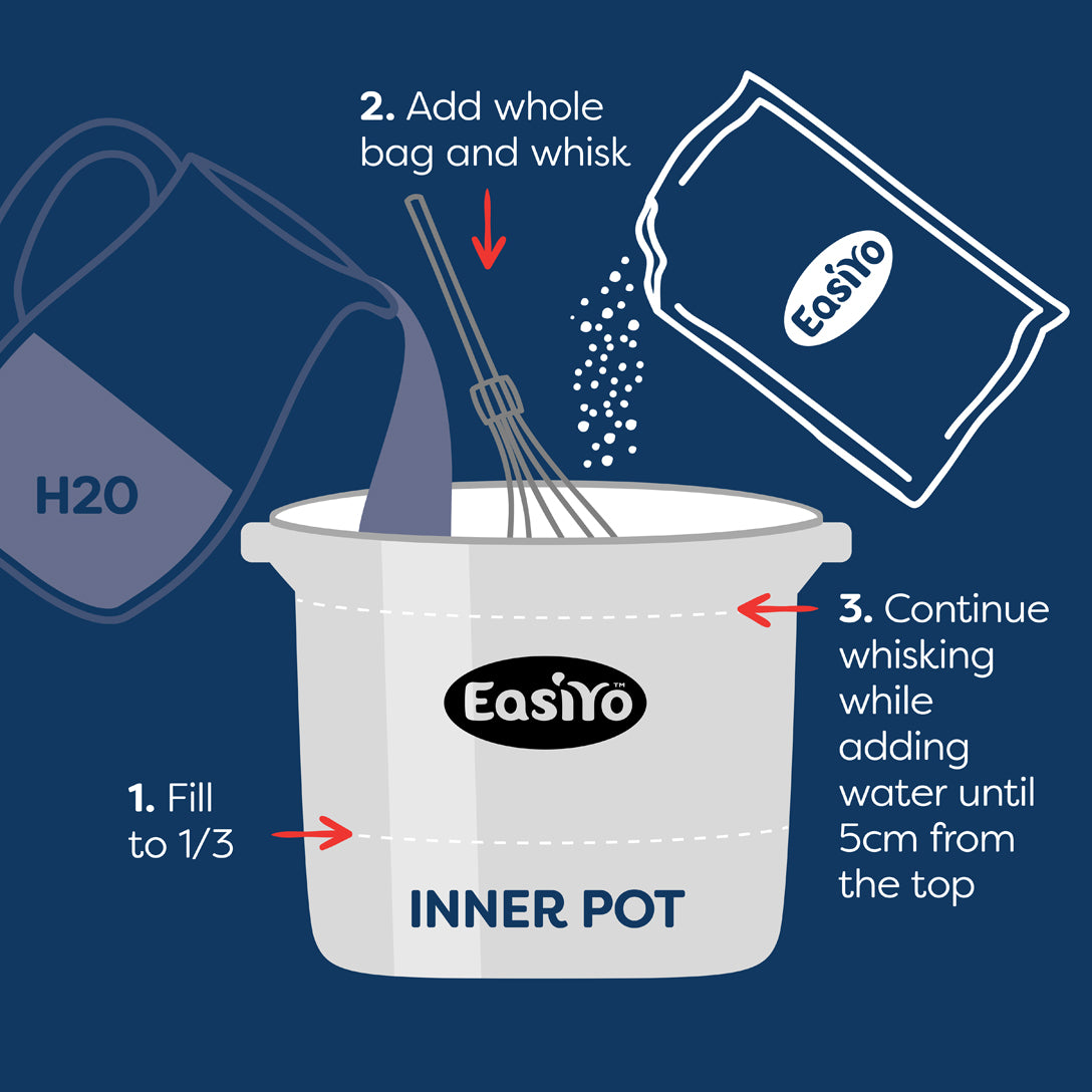 Third-fill the inner pot with room temperature drinking water and thoroughly whisk in a whole bag of EasiYo Yogurt Base. Continue whisking while topping up with more water.